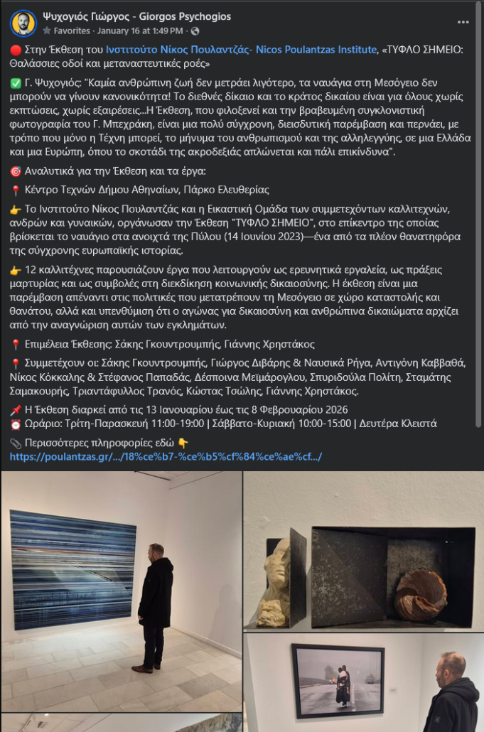 Ο Τομεάρχης Μετανάστευσης και Ασύλου και βουλευτής Κορινθίας ΣΥΡΙΖΑ-ΠΣ, Γ. Ψυχογιός, κατά την επίσκεψή του στην Έκθεση «Τυφλό Σημείο: Θαλάσσιες οδοί και μεταναστευτικές ροές», από το Ινστιτούτο Νίκος Πουλαντζάς και Εικαστική Ομάδα 12 καλλιτεχνών, στο Κέντρο Τεχνών Δήμου Αθηναίων, δήλωσε: